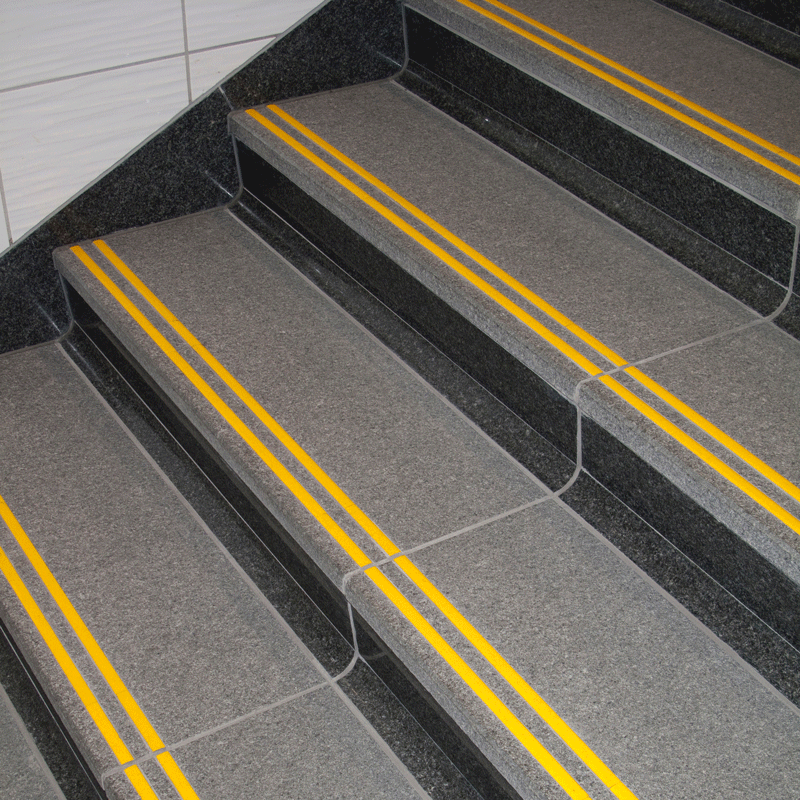 Những tai nạn trượt ngã ở khu vực cầu thang thường dẫn đến những hậu quả chấn thương nghiêm trọng. Cầu thang có độ dốc khá cao và các bật thang cao thấp nối dài với nhau. Nếu công nhân đi giày thông thường thì phần đế giày thường sẽ có độ bám thấp, đây là nguyên nhân dẫn đến cái trường hợp trượt ngã cầu thang. Sử dụng băng keo chống trượt trên mỗi bậc thang, sẽ giúp công nhân không bị trượt, điều này đặc biệt quan trọng nếu công nhân đi giày thông thường không có độ bám.