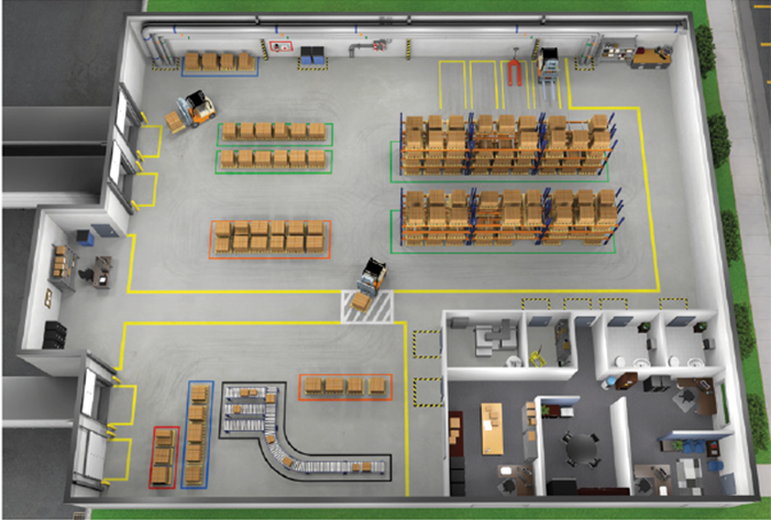 - Sử dụng các màu băng khác nhau, biển báo sàn và băng dán sàn cho từng khu vực như đường đi bộ, làn đường dành cho xe nâng, vị trí pallet, khu vực nguy hiểm, kho nguyên liệu, khu vực cần thông thoáng, và các khu vực khác của tổ chức.