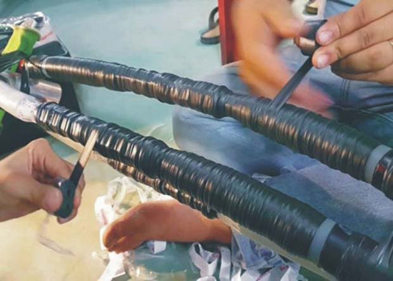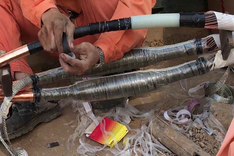 Thi công quấn băng keo chống ẩm cho mối nối cáp ngầm để ngăn nước thấm và tăng độ bền cách điện.