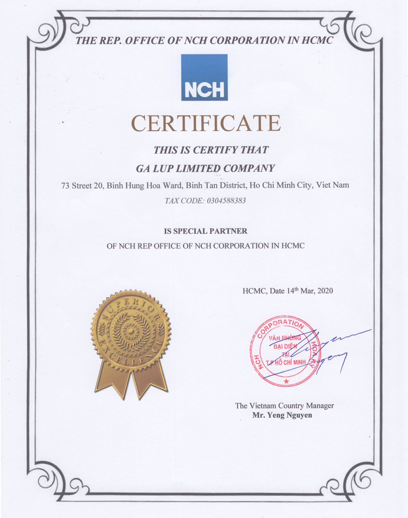 Là doanh nghiệp phân phối chính thức các sản phẩm công nghiệp của tập đoàn 3M, Avery Dennision, Milwaukee và NCH. Tất cả sản phẩm của GALUP đều có đầy đủ giấy tờ kiểm định cũng như chế độ bảo hành chính hãng.