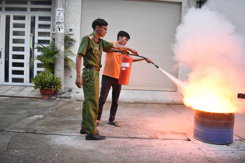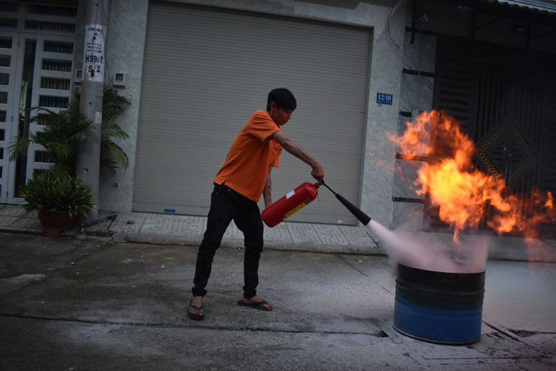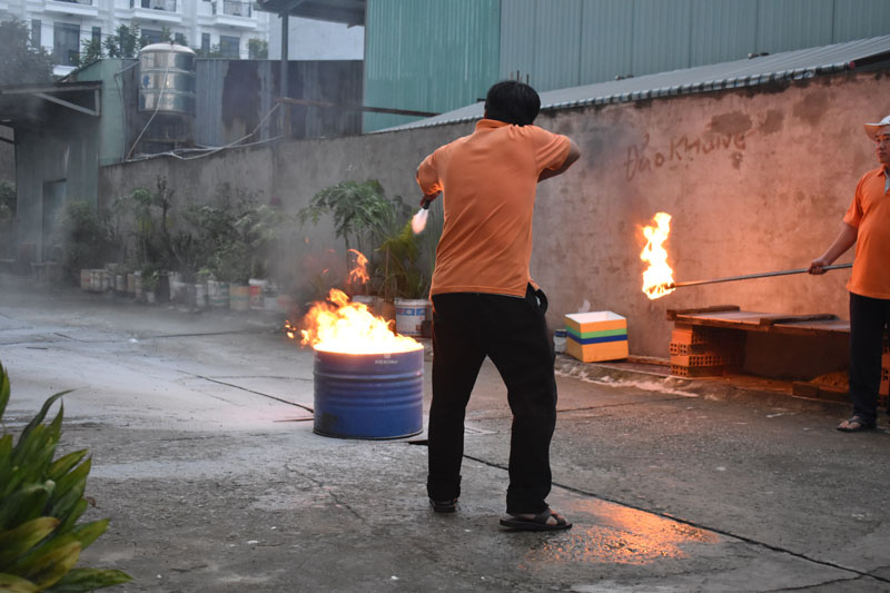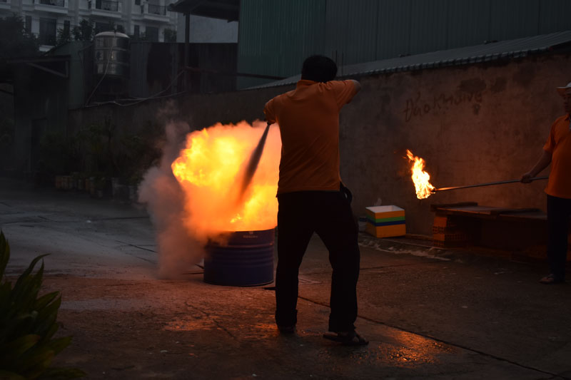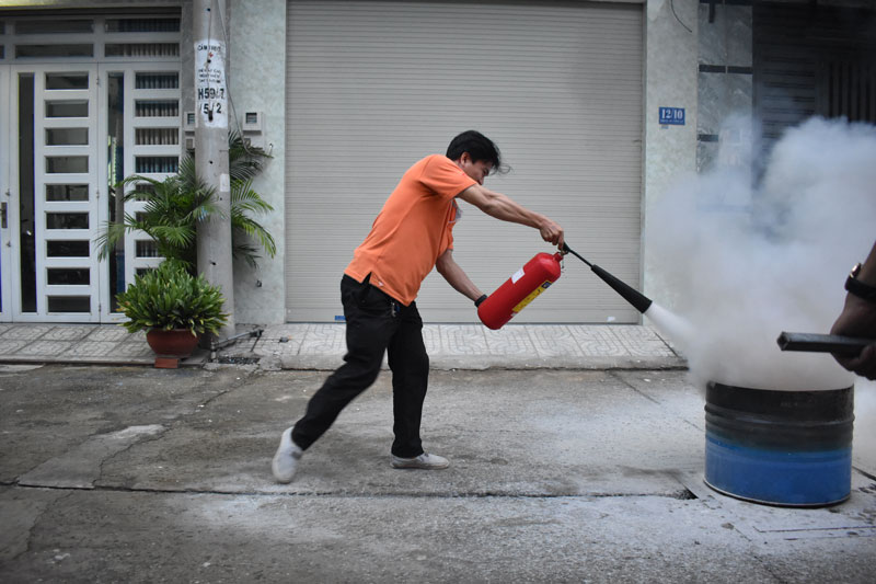 Sau phần hướng dẫn lý thuyết 10 nhân viên Galup trực tiếp thực hành nhiệm vụ dập tắt lửa với bình chữa cháy.
