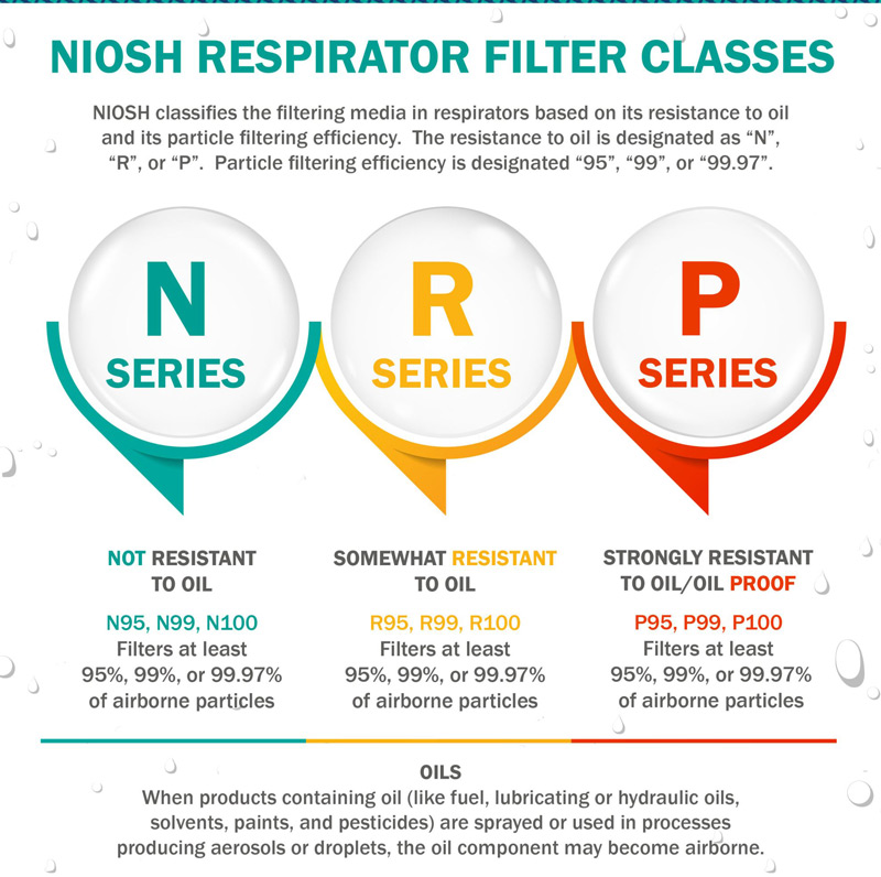 - Phân loại: N95, N99, N100 (lọc bụi không dầu) và R95, P95, P100 (lọc bụi có dầu).
